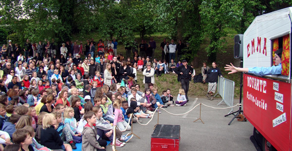 En bas du Bourg, c'est la compagnie Une de Plus qui s'installe avec son Théâtre de la Greluche, spectacle drôle et poétique qui mêle mime, musique et marionnettes.